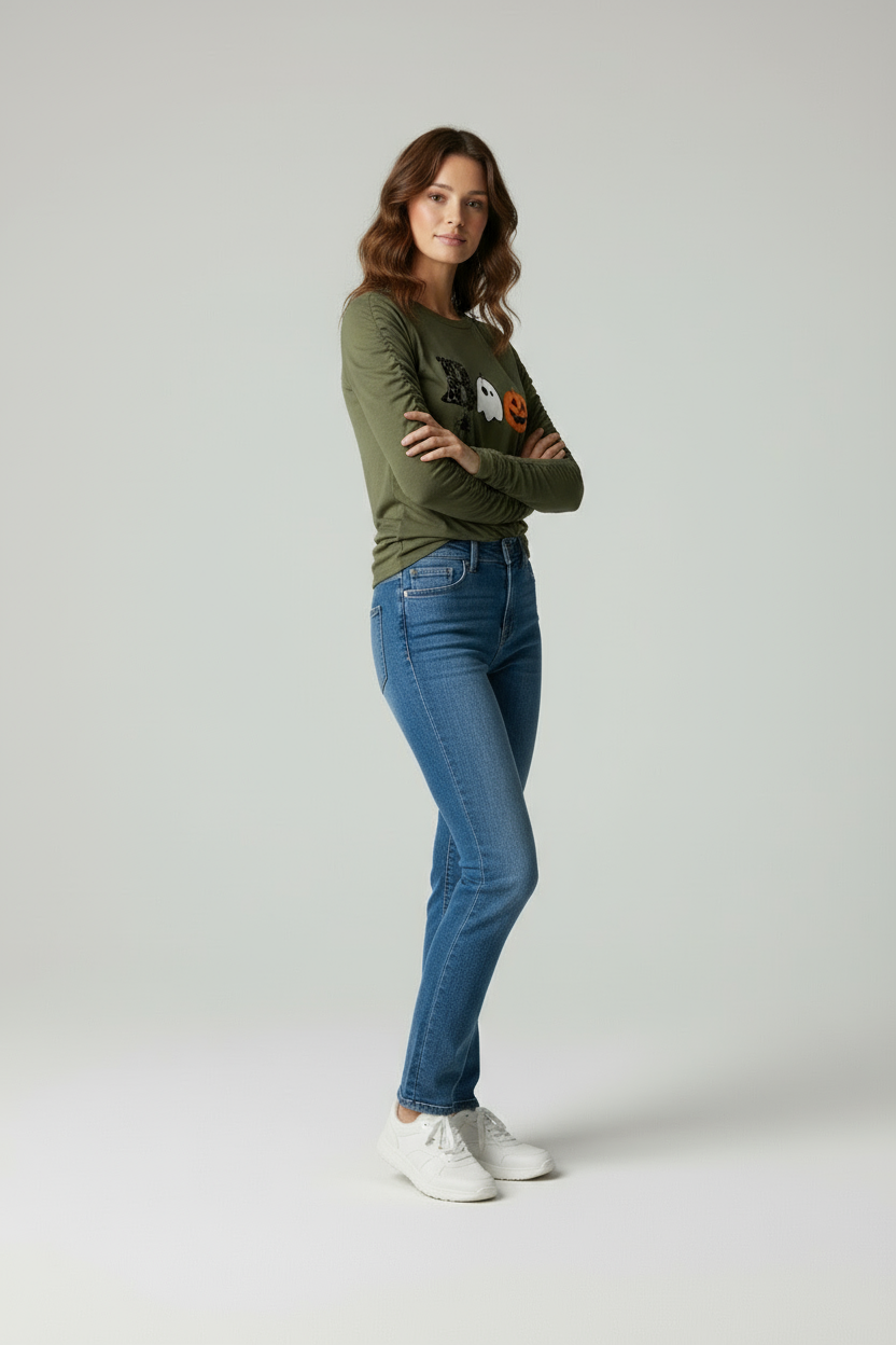 Voel de huiveringwekkende opwinding van de herfst met dit sublieme Groen Halloween BOO Print Lange Mouwen Shirt, ontworpen om u de perfecte mix van comfort en feestelijke flair te bieden. Draag deze chique, casual look naar elk herfstevenement en straal moeiteloos seizoensgebonden charme uit terwijl u geniet van de superieure kwaliteit van Julie Mae.