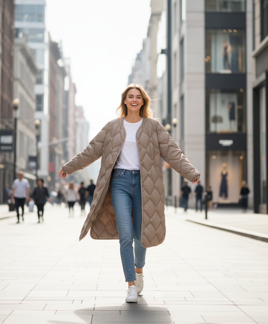 Ervaar de ultieme omhelzing van warmte en lichtheid met deze onmisbare Schinteon jas, ontworpen om u moeiteloos door de koudere seizoenen te begeleiden. De subtiele diamantquilt en flatterende V-halslijn creëren een geraffineerde look, waardoor u zich zowel geborgen als elegant voelt tijdens uw herfst- en winterwandelingen.