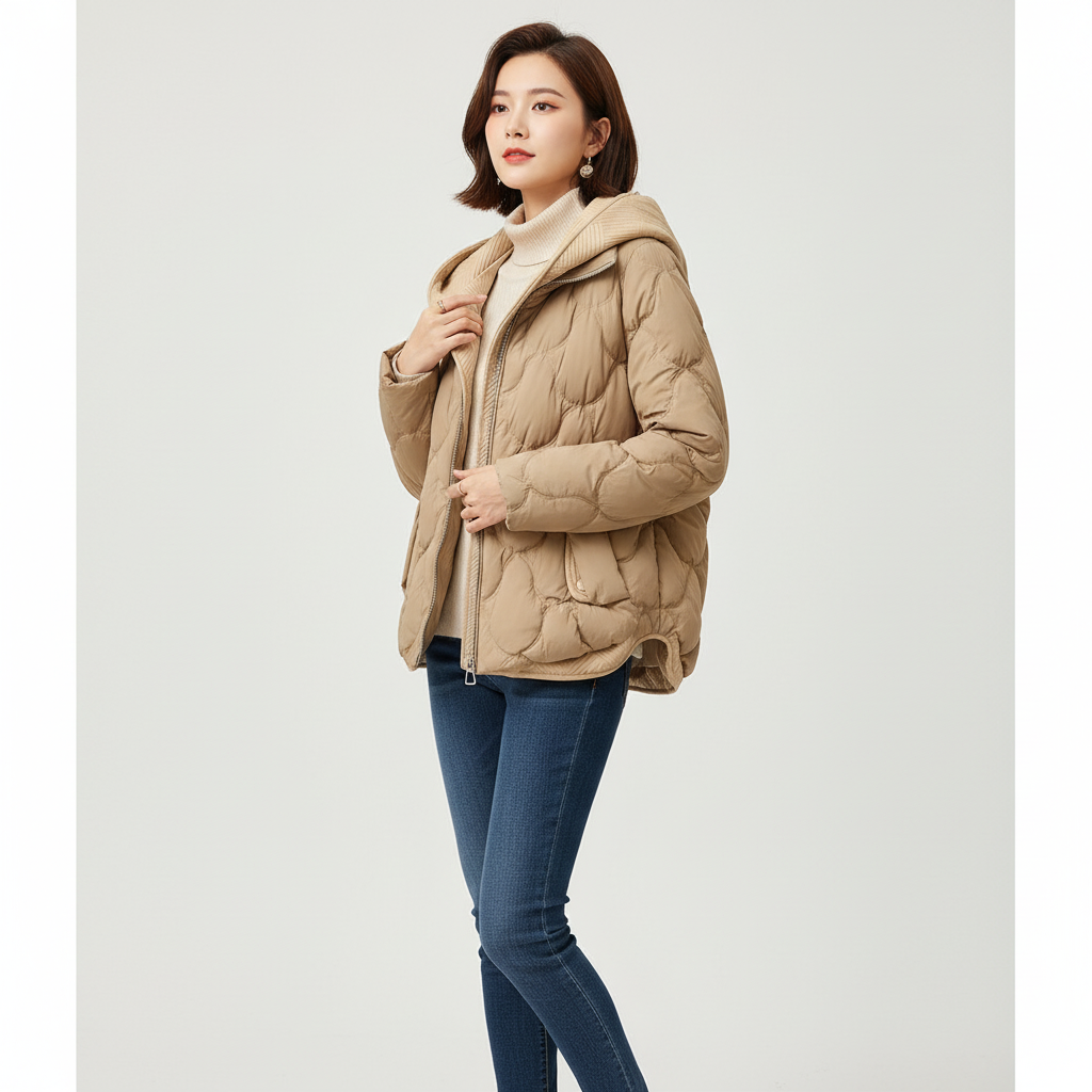 Deze gewatteerde jas combineert een speelse, unieke stikselpatroon met een comfortabele, oversized pasvorm en een stijlvolle, hoge gebreide kraag, perfect voor moeiteloze flair tijdens de koudere maanden.