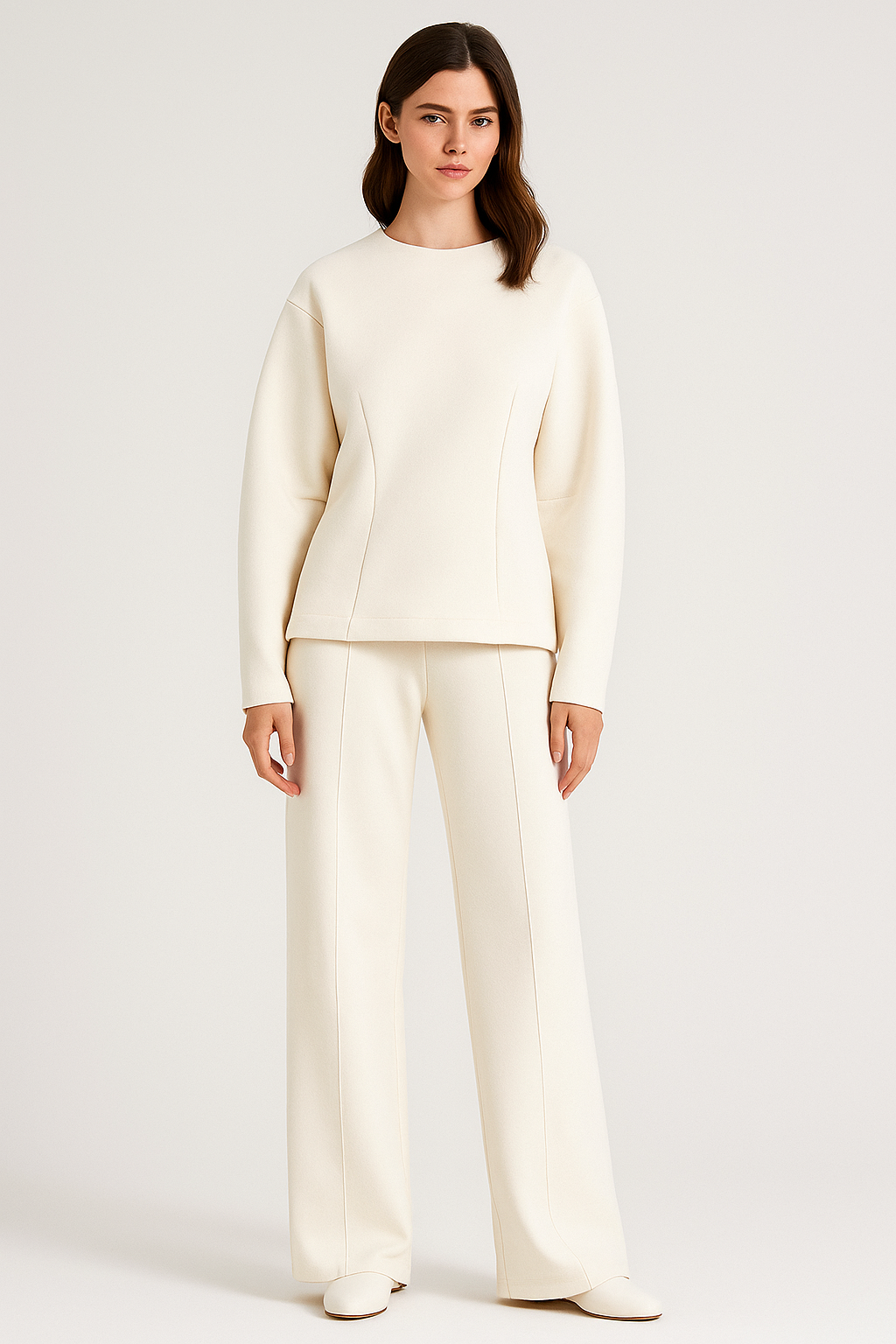De KYLIANA set brengt luxe comfort en tijdloze stijl samen in één ontwerp. Met een oversized top en een high-waisted wijde broek creëer je moeiteloos een elegante, moderne look die perfect is voor zowel thuis als casual gelegenheden.