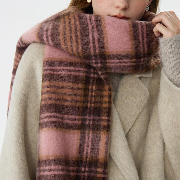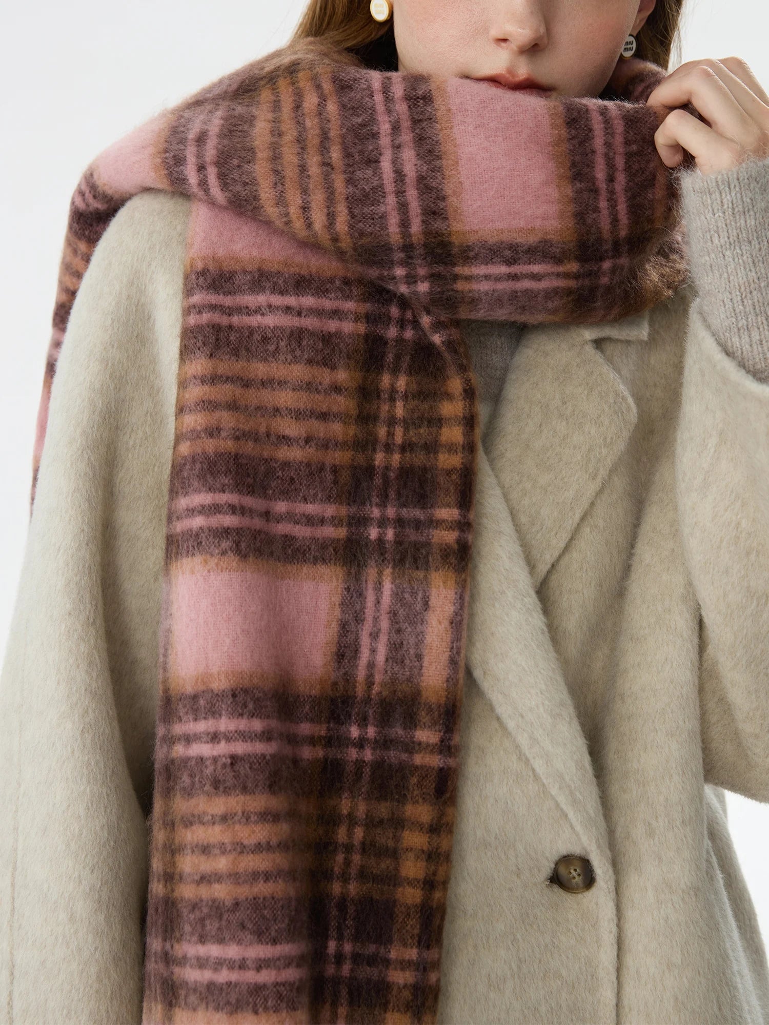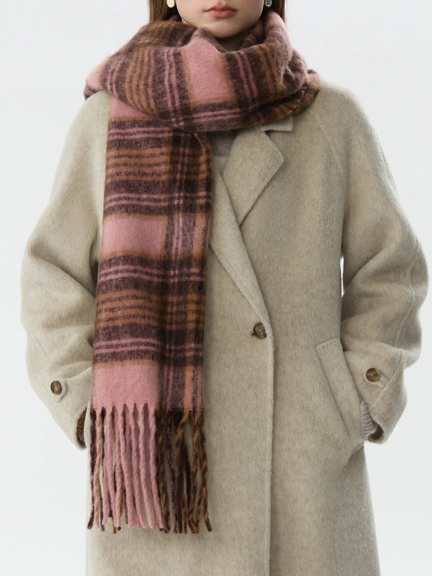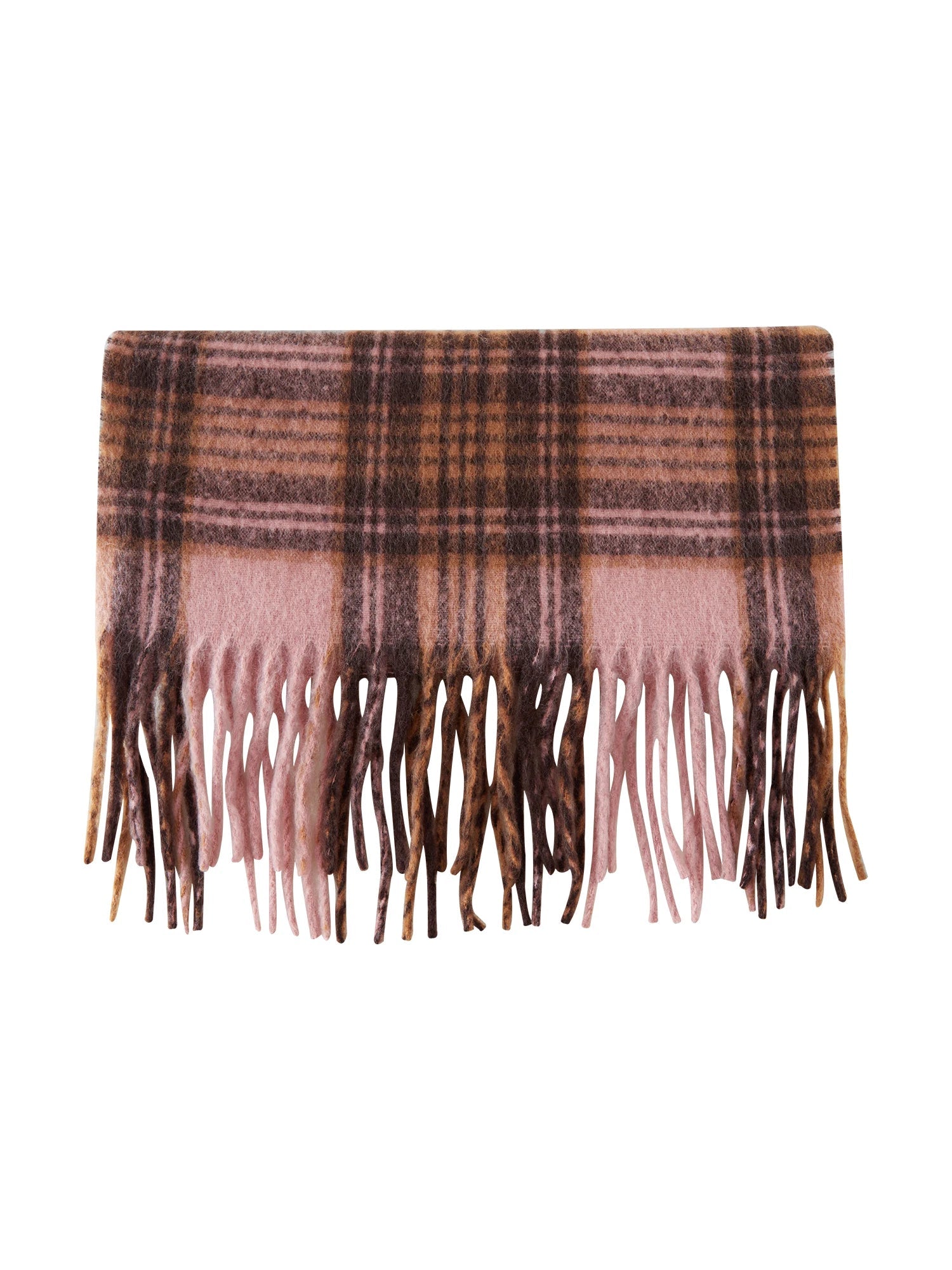 Voel de omhelzing van pure winterse zachtheid en stap vol zelfvertrouwen de kou in. Dit prachtige geruite ontwerp in zachte roze en rijke koffietinten voegt direct een element van verfijnde warmte toe aan uw dagelijkse look.