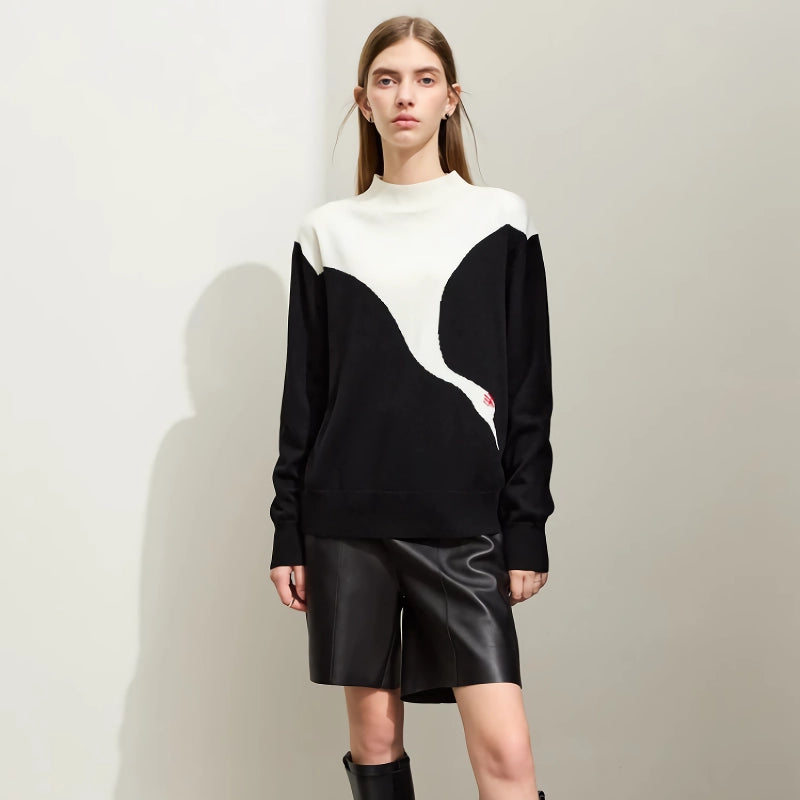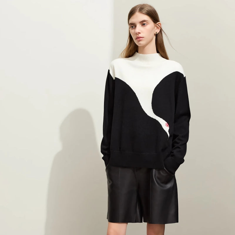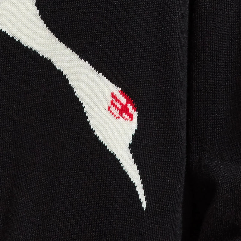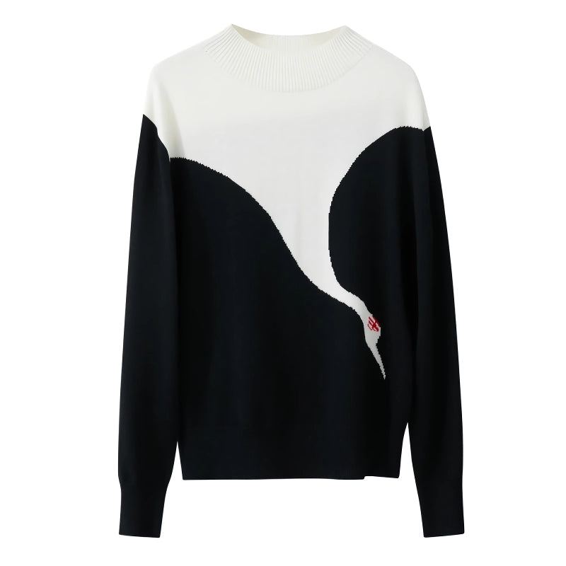 Ervaar de serene elegantie die uw wintergarderobe verdient met deze uitzonderlijke gebreide creatie. Dit meesterwerk van Julie Mae combineert de tijdloze schoonheid van de kraanvogel met een modern, zwart-wit contrast, waardoor u zich direct gekleed en verfijnd voelt, zelfs op de koudste dagen.